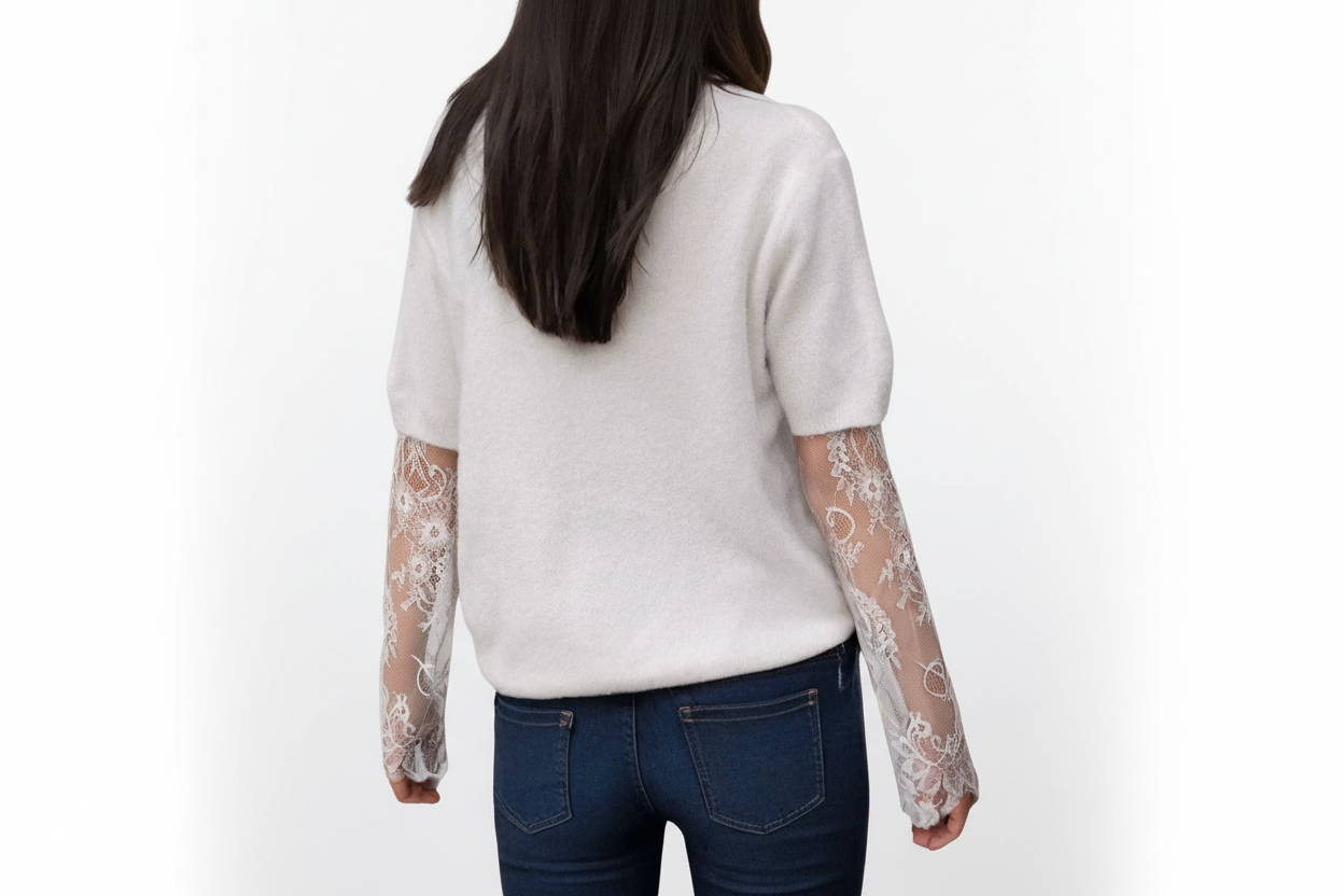 Trust us..you want this sweater in your life and in your wardrobe! This sweater is one piece with lace sleeves and a lace peek-a-boo around the neckline. It's fuzzy and thin! The perfect transition into spring!